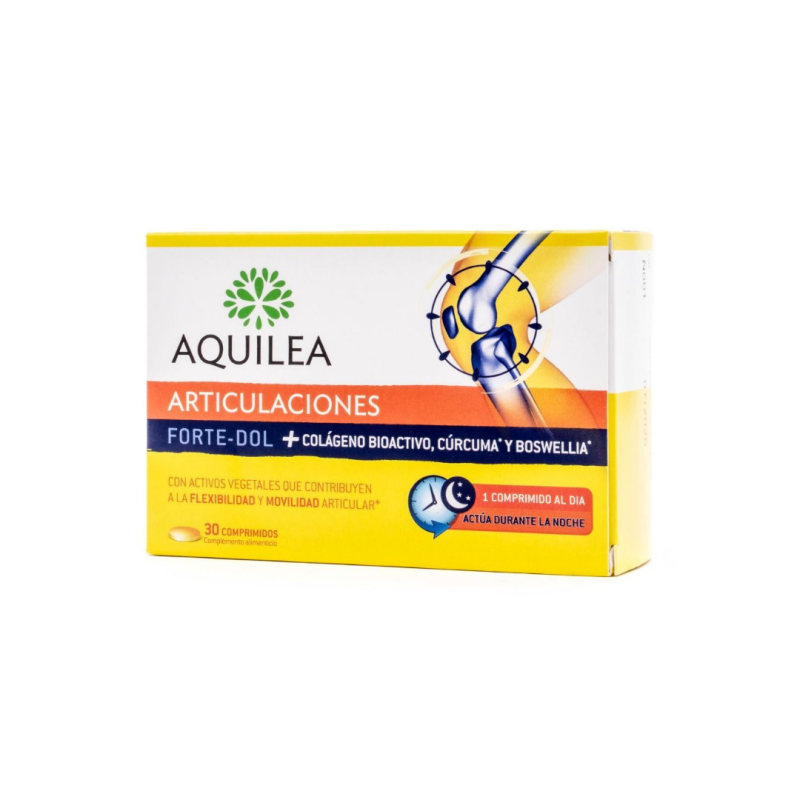 Aquilea Articulaciones Forte-Dol comprimidos es la forma natural para cuidar de tu movilidad gracias a que contiene:\r\n\r\n· Colágeno bioactivo tipo II, que es una proteína que se encuentra naturalmente en los cartílagos, huesos y piel. Las proteínas, como el colágeno, contribuyen al mantenimiento de huesos u músculos en condiciones normales. El Colágeno bioactivo tipo II tiene la misma estructura que el colágeno que se encuentra en las articulaciones y el tejido conectivo de los cartílagos.\r\n\r\n· La Boswellia y la Cúrcuma ayuda a mantener la flexibilidad y el bienestar de las articulaciones así como a mantener una buena movilidad.\r\n\r\n· El Ácido Hialurónico un componente esencial que se encuentra de manera natural en las articulaciones y cartílagos.\r\n\r\n· El extracto de Pimienta Negra que mejora la absorción de las plantas para una acción sinérgica.\r\n\r\n· Y la Vitamina C que contribuye a la normal formación de colágeno para el funcionamiento normal del cartílago, los huesos y la piel.\r\n\r\n