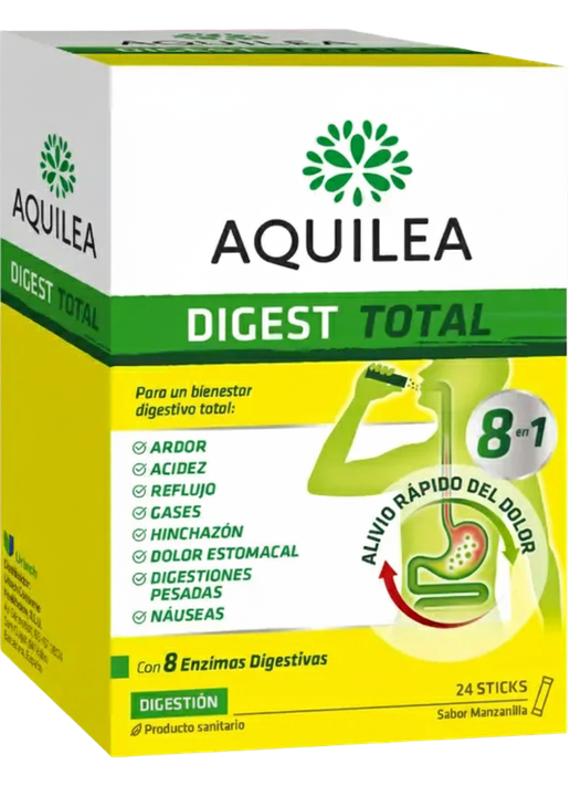 Aquilea Digest Total es un multisíntomas que actua rápidamente combatiendo 8 síntomas digestivos: acidez, ardor, reflujo, gases, hinchazón, dolor de estómago, digestiones pesadas y náuseas. Todo ello gracias a una combinación eficaz de ingredientes y 8 enzimas digestivas.