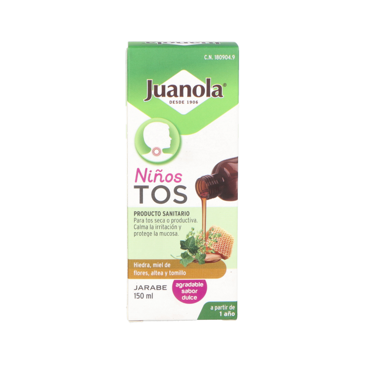 JUANOLA TOS NIÑOS es un jarabe formulado especialmente para el alivio de la tos en niños. Su composición combina ingredientes naturales que ayudan a calmar la irritación de la garganta y facilitan la expulsión del moco, promoviendo una respiración más cómoda y efectiva.