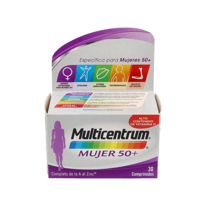 MULTICENTRUM MUJER 50+ es un complejo multivitamínico formulado específicamente para satisfacer las necesidades nutricionales de las mujeres a partir de los 50 años. Este producto ayuda a mantener un estilo de vida saludable al proporcionar nutrientes esenciales que apoyan el bienestar general.