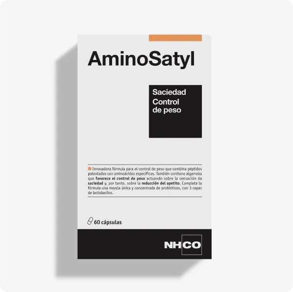 AminoSatyl tiene una fórmula innovadora con 13 ingredientes. Contiene una\r\ngran concentración de aminoácidos y algarroba, que ayuda a aumentar la\r\nsensación de saciedad y a reducir el apetito, ayudando así al control de peso.\r\nAdemás, contiene 2 activos innovadores y científicamente testados:\r\nPeptiSat-10AA, que ayuda a regular las hormonas de la saciedad, y una mezcla\r\nde cepas probióticas que influyen en la grasa visceral.\r\n\r\nAminoSatyl es un complemento alimenticio que favorece el control de peso, actuando sobre la\r\nsensación de saciedad y, por tanto, sobre la reducción del apetito.13\r\nSu innovadora fórmula contiene:\r\nAminoácidos específicos y PeptiSat-10AA (péptidos patentados) que, ayudando a regular\r\nlas hormonas de la saciedad, ha demostrado una reducción de la ingesta desde la\r\nprimera semana.1\r\nAminoácidos como la L-carnitina y la L-arginina que participa en la termogénesis.7\r\nCepas probióticas estudiadas científicamente que contribuyen a la disminución de la\r\ngrasa visceral.8\r\n\r\nDe 30 a 60 minutos antes de la comida principal del día. 3 cápsulas