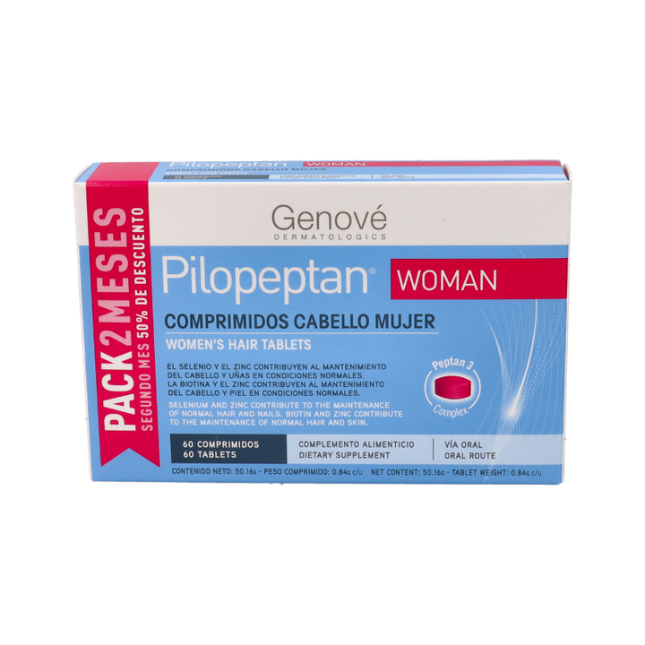 PILOPEPTAN WOMAN es un complemento alimenticio diseñado para contribuir a la salud del cabello y las uñas de la mujer. Este pack de 2 meses contiene 60 comprimidos que aportan una fórmula única y equilibrada, desarrollada para atender las necesidades específicas de las mujeres. Gracias a su combinación de ingredientes, ayuda a fortalecer el cabello, mejorar su apariencia y promover su crecimiento.