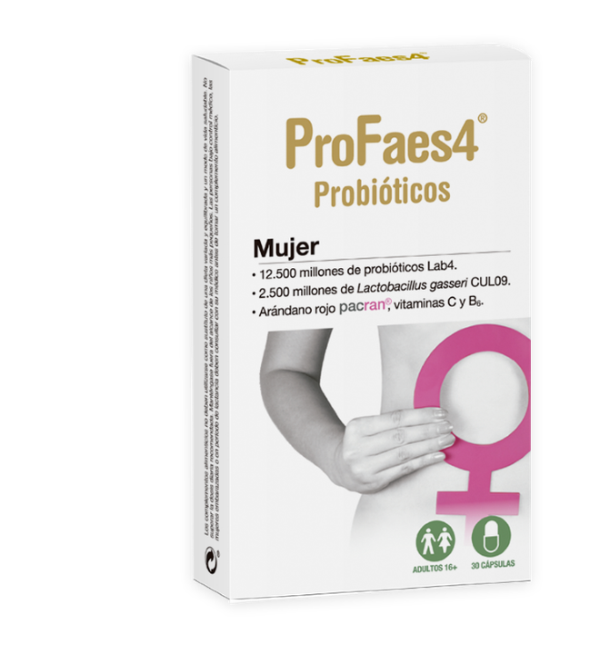 ProFaes4® Mujer, combinación única de probióticos Lab4, Lactobacillus gasseri CUL09, extracto de Arándano Rojo pacran®, vitaminas B6 y C, especialmente formulado para la mujer. Contiene ingredientes, como el Lactobacillus gasseri CUL09, especialmente seleccionada por ser un componente habitual de la microbiota vaginal normal, o las vitaminas B6 y C que contribuyen al funcionamiento normal del sistema inmunitario.