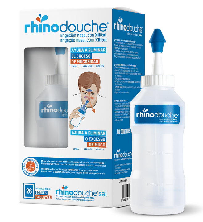 RHINODOUCHE es un sistema de higiene nasal diseñado para aliviar la congestión y mantener la salud de las vías respiratorias. Su combinación con SINUSAL, un complemento en sobres que apoya la función respiratoria, resulta ideal para usuarios que buscan un alivio efectivo frente a problemas nasales.