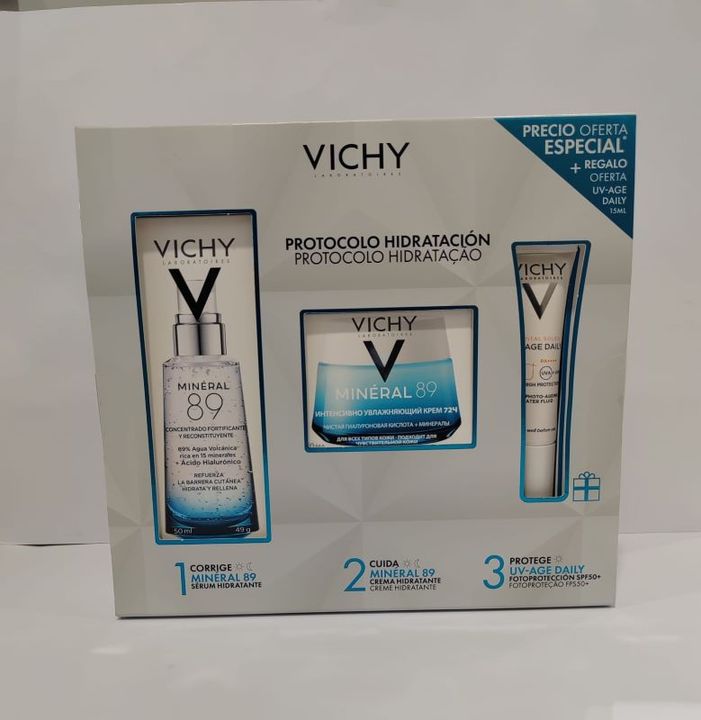MINÉRAL 89 es un concentrado fortificante y reconstituyente diario compuesto por un 89 % de agua mineral de Vichy, con ácido hialurónico de origen natural. Usado cada mañana como primer paso en la rutina diaria, hidrata y tonifica la piel. Día tras día, se muestra más luminosa y con un aspecto saludable.