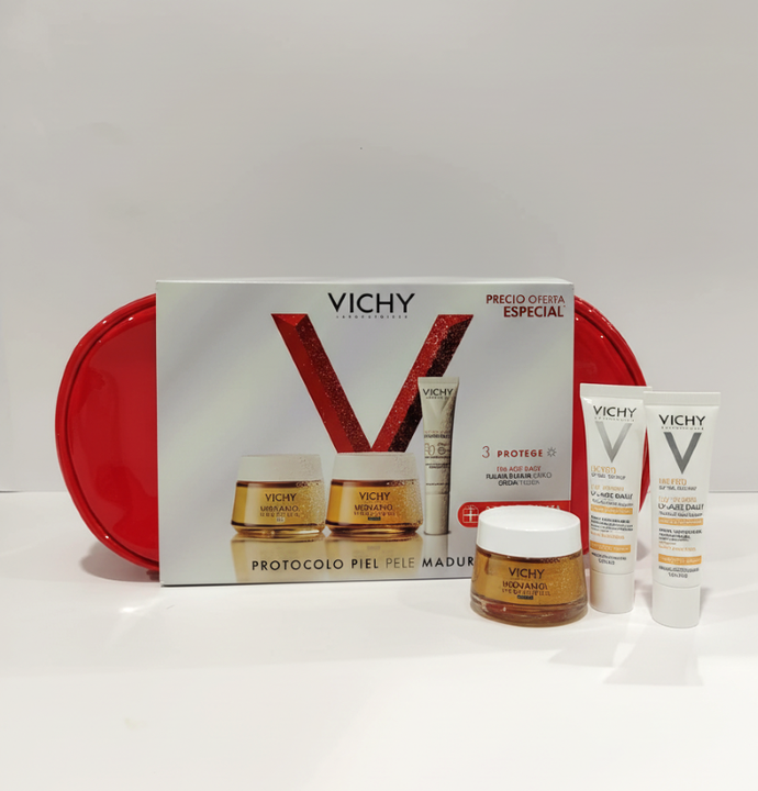 - VICHY Cofre Protocolo Piel Madura está diseñado específicamente para atender las necesidades de las pieles maduras, proporcionando una solución global para el cuidado y la hidratación.